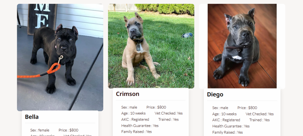 The website claims to be a dedicated breeding program focused on healthy Cane Corso puppies, offering vet-checked, AKC-registered, trained, and family-raised puppies for $800. They state they provide health guarantees, complete medical records, and starter packages, and screen potential families to ensure puppies are placed in loving homes. This website is a scam. The Better Business Bureau has received reports of this site posing as a legitimate breeder and taking money without providing puppies. The listed prices are unusually low for Cane Corso puppies, which is a common tactic used by scammers. It is advisable to avoid this website.