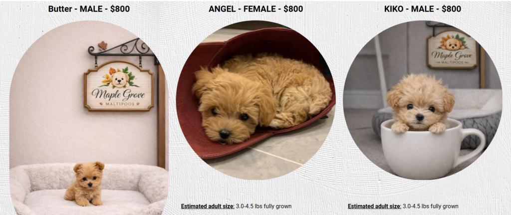 Maple Grove Maltipoos (fake puppy breeder scam) uses generic keywords and fake reviews. Buyer beware; this is not a real breeder and there are multiple reports of them stealing money.